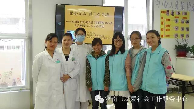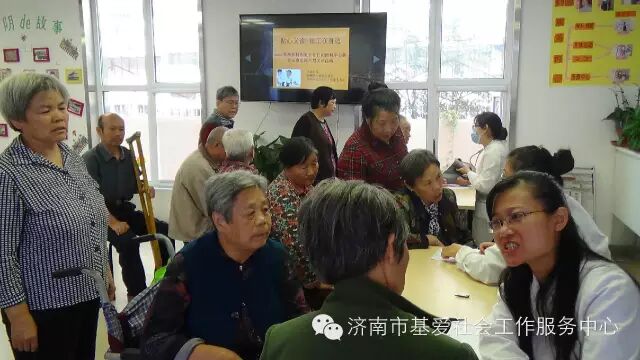 义诊结束中心社工与安康医院医生合影甸柳新村街道长者日间照料中心,由甸柳街新村道办事处和济南市基爱社会工作服务中心合作,为甸柳新村街道辖区内60岁及以上长者及护老者为服务对象,运用专业社工的社区照顾理念和参与式社区发展的工作手法提供全面的社区养老服务。中心借鉴香港长者地区中心的运营经验,将专业系统评估辖区长者的不同需求,提供菜单式社区照顾服务,整合社区内包括老年公寓、日间照料中心、社区文化活动场所、社区医院等在内的多方资源,为辖区长者及护老者提供包括生活照顾、健康管理与干预、健康教育、康复护理、家居环境改善、护老者支援与培训、信息咨询、精神慰藉、文化娱乐以及偶到等服务。